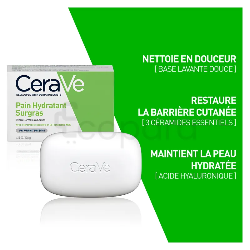 Caractéristiques : Développé avec des dermatologues, le Pain Nettoyant Hydratant CeraVe nettoie et hydrate sans altérer la barrière protectrice de la peau. Sa texture crémeuse et moussante, aux 3 céramides essentiels et à l'acide hyaluronique, contient 5% de crème hydratante CeraVe qui assure l'hydratation tout en éliminant les impuretés, l'excès de sébum et le maquillage pour une peau plus douce. - Texture crémeuse, hydratante et moussante. Sécurité : - Sans parfum. - Hypoallergénique. - Testée sous contrôle dermatologique. - Non-Comédogène : ne bouche pas les pores. Ingrédients & Principes Actifs Clés : - 3 Céramides Essentiels : tous les produits CeraVe contiennent les 3 céramides essentiels (1, 3 et 6-II) dont une peau saine a besoin pour restaurer et maintenir sa barrière protectrice naturelle. - Technologie brevetée de diffusion MVE : libération contrôlée et prolongée d'actifs pour une hydratation continue pendant 24h. - Acide hyaluronique : maintient l'hydratation naturelle de la peau. Conseils d'Utilisation : - Appliquer quotidiennement votre savon surgras sur votre peau humide en massant légèrement votre visage et corps. - Ensuite, rincer soigneusement à l’eau claire puis sécher délicatement. Parfaitement nettoyée et durablement hydratée, votre peau, qu’elle soit sèche à très sèche, est douce et soyeuse. Complétez votre routine en appliquant sur le visage et sur le corps votre crème soin hydratant quotidienne. Composition : SODIUM COCOYL ISETHIONATE, STEARIC ACID, AQUA/WATER, SODIUM ISETHIONATE, COCAMIDOPROPYL HYDROXYSULTAINE, ETHYLENE BRASSYLATE, CI 77891/TITANIUM DIOXIDE, SODIUM CHLORIDE, GLYCERIN, CETEARYL ALCOHOL, CAPRYLIC/CAPRIC TRIGLYCERIDE, CETYL ALCOHOL, CETEARETH-20, PETROLATUM, DIMETHICONE, PHENOXYETHANOL, BEHENTRIMONIUM METHOSULFATE, POTASSIUM PHOSPHATE, ETHYLHEXYLGLYCERIN, SODIUM LAUROYL LACTYLATE, DISODIUM EDTA, DIPOTASSIUM PHOSPHATE, CERAMIDE NP, CERAMIDE AP, PHYTOSPHINGOSINE, CHOLESTEROL, XANTHAN GUM, CARBOMER, SODIUM HYALURONATE, TOCOPHEROL, CERAMIDE EOP. Les listes d’ingrédients entrant dans la composition des produits de notre marque sont régulièrement mises à jour. Avant d’utiliser un produit de notre marque, vous êtes invités à lire la liste d’ingrédients figurant sur son emballage afin de vous assurer que les ingrédients sont adaptés à votre utilisation personnelle.